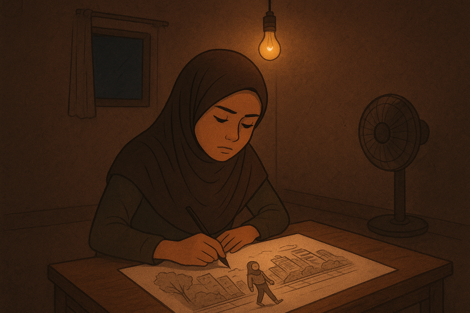 Tanpa berpikir panjang, ia mengambil kertas A3 bekas dan mulai menggambar ulang dari awal. Kali ini tanpa laptop, tanpa warna digital, hanya pensil, spidol, dan air mata yang menetes di ujung jemarinya. Ia menggambar hingga lewat tengah malam, dengan cahaya lampu bohlam yang berkelap-kelip karena arus listrik yang tak stabil. Tapi dalam setiap goresan, ada tekad yang semakin menguat.